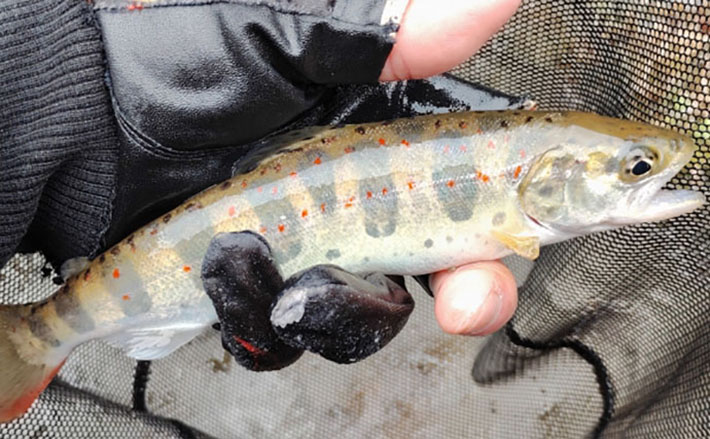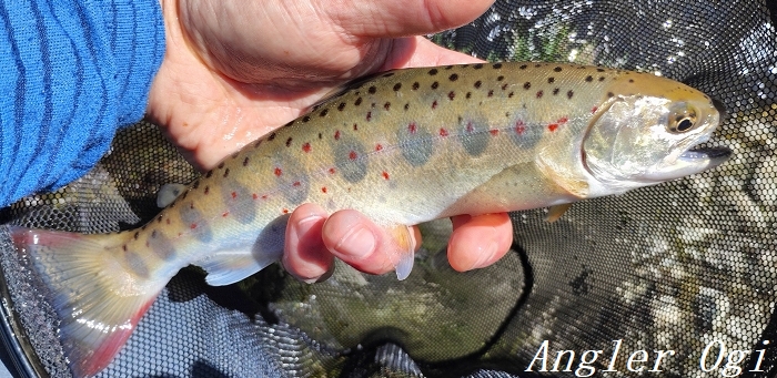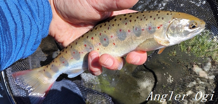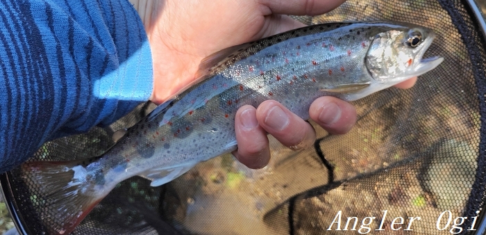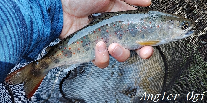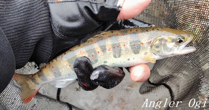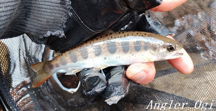 2本目の支流の退渓場所近くでようやくアタリが出て、この1匹を釣るのがやっと。